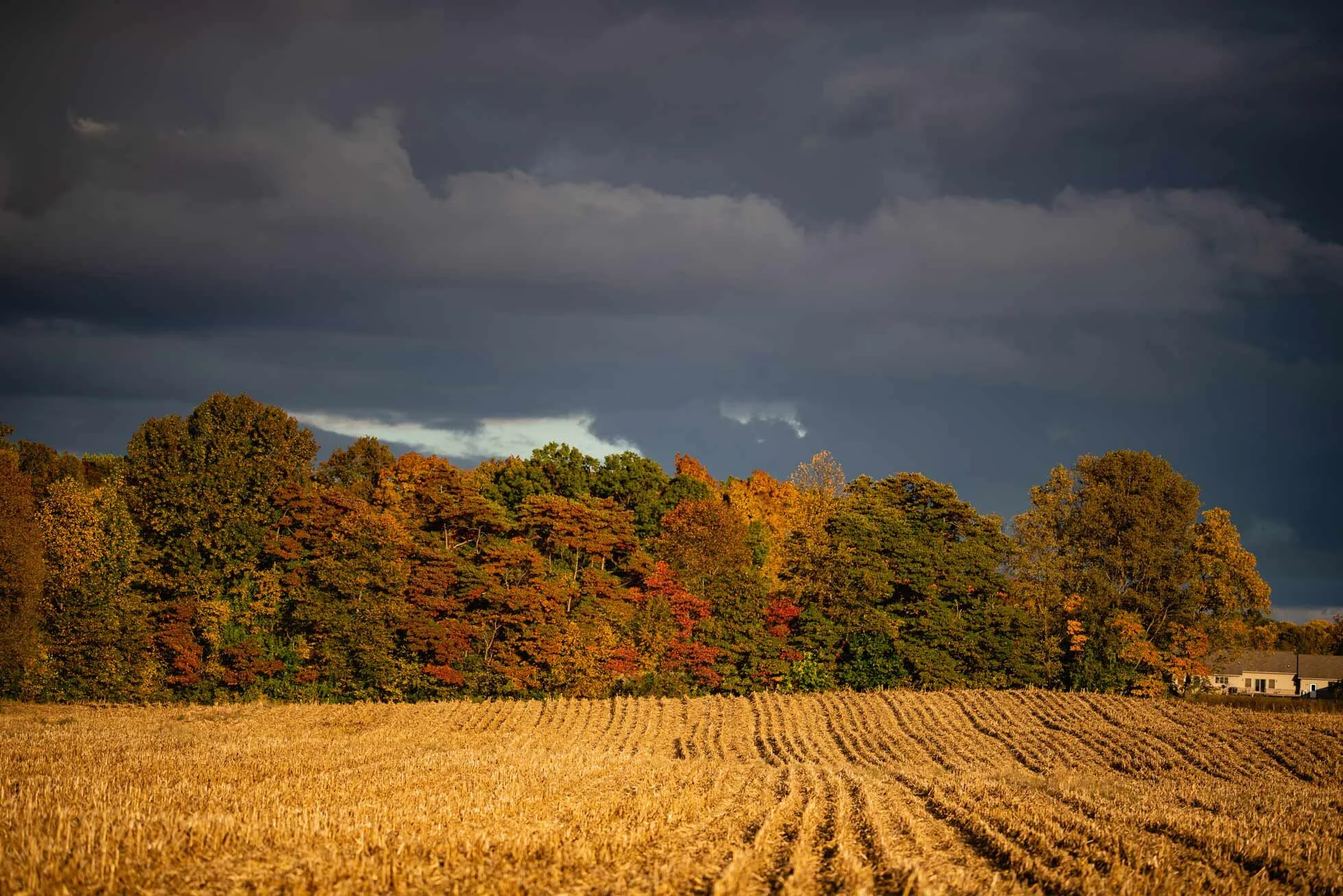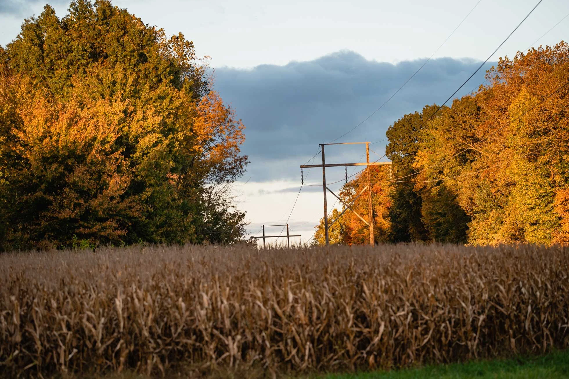 The leaves are changing and making a beautiful background for the tan stalks of corn. The smell of the decaying leaves is musky sweet and brings memories of falls past.